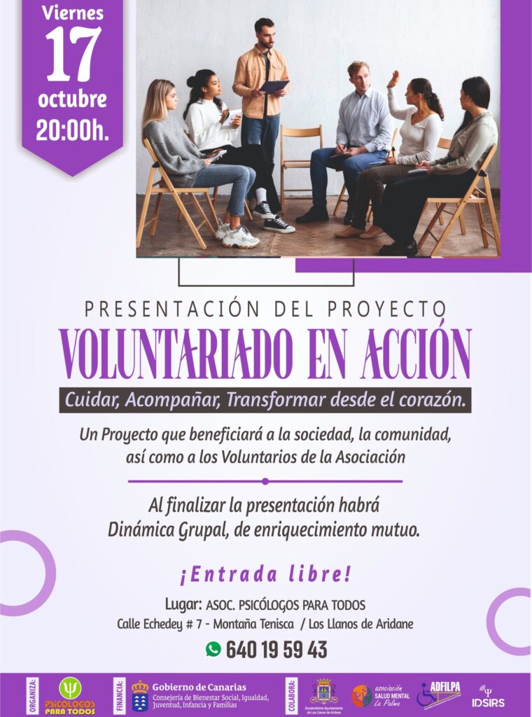 El proyecto “Voluntariado en Acción”, Cuidar, acompañar, transformar desde el corazón, tiene como finalidad fortalecer la red de apoyo psicosocial y emocional en la isla de La Palma, promoviendo la solidaridad, el acompañamiento y el bienestar integral de las personas más vulnerables —especialmente mayores, personas con discapacidad, familias en situación de vulnerabilidad y personas afectadas por el volcán de Cumbre Vieja.