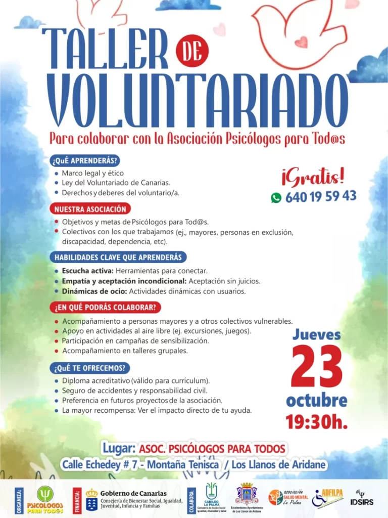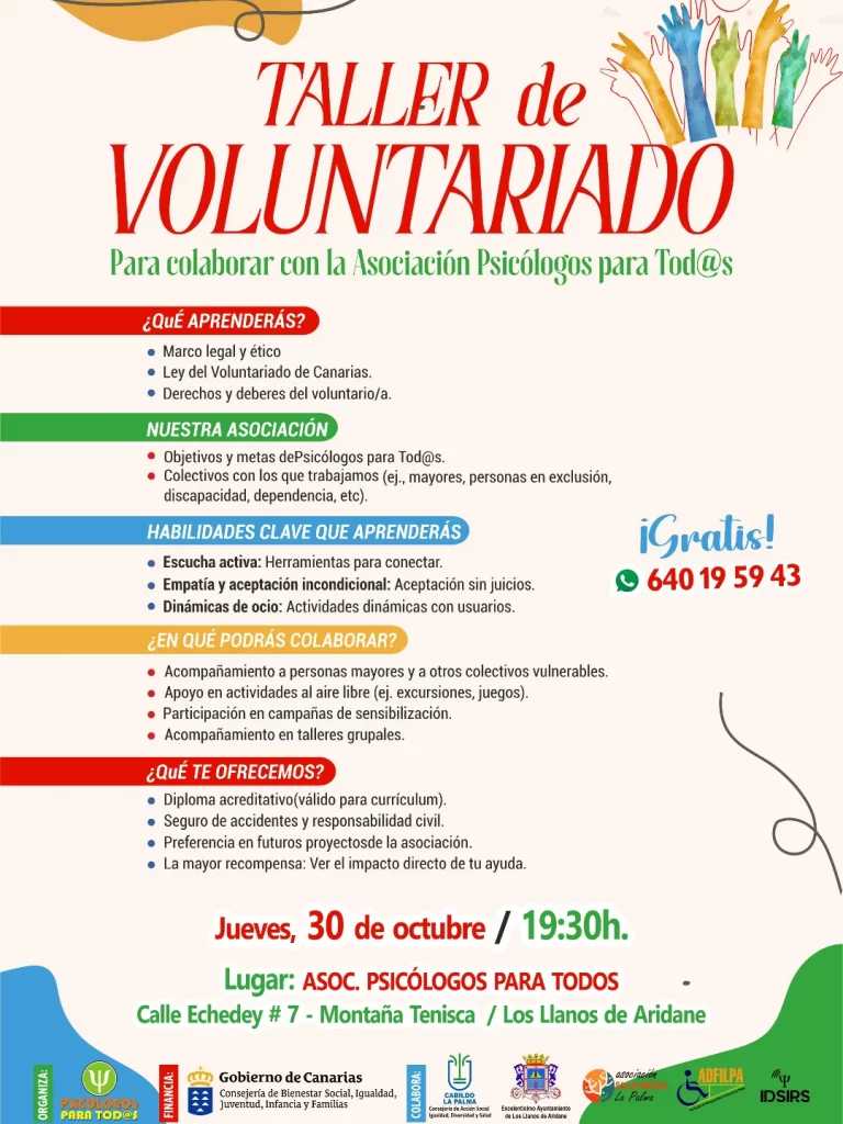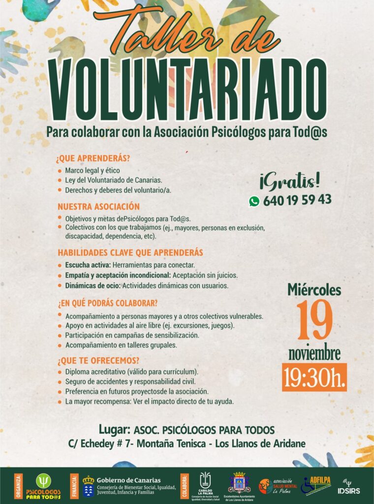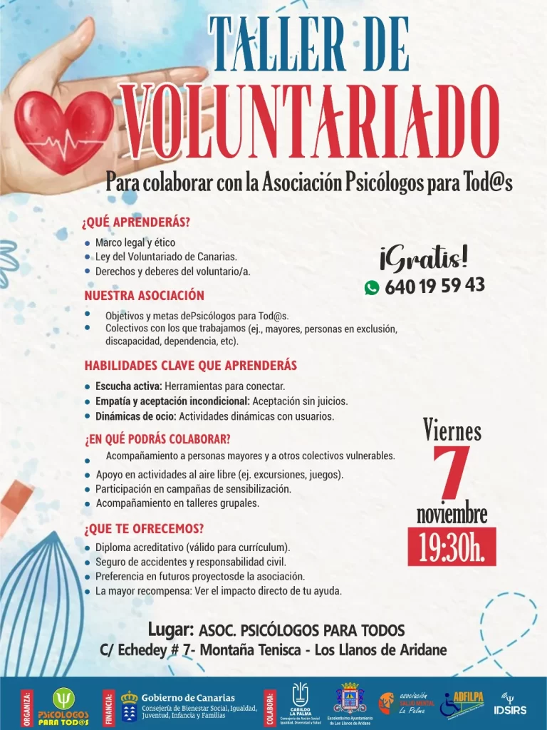 Desde la Asociación Psicólogos para Todos, se impulsa un programa estructurado de voluntariado social y formativo, donde las personas voluntarias reciben orientación y acompañamiento profesional para desarrollar habilidades de escucha, empatía, contención emocional y apoyo comunitario.